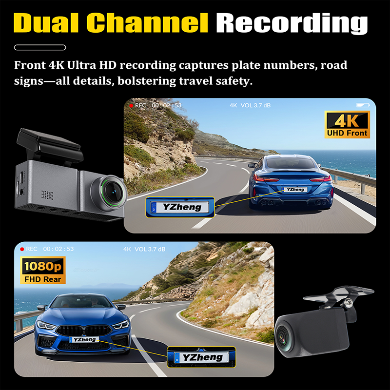This car dashcam is equipped with the All Winner V851S CPU and SC4653+GC2083 sensors, this dash cam delivers stunning 4K+1080P resolution at 25fps. It ensures crystal‑clear footage day and night, capturing every detail on the road. The 2G4P lens with F1.8 aperture further enhances low‑light performance for sharp nighttime recording.